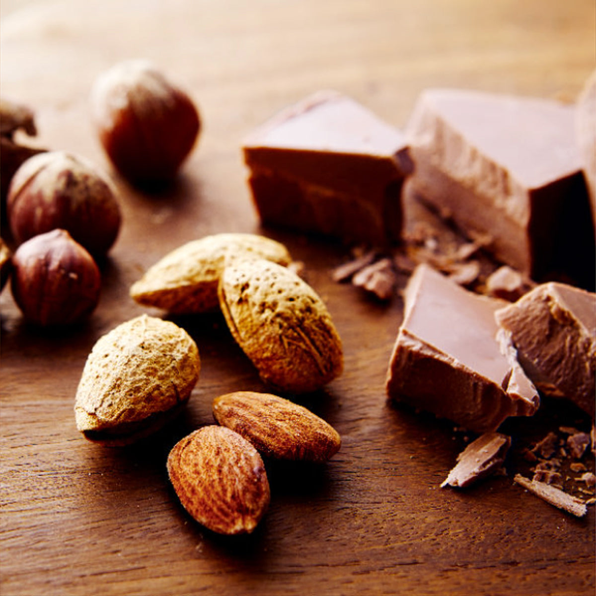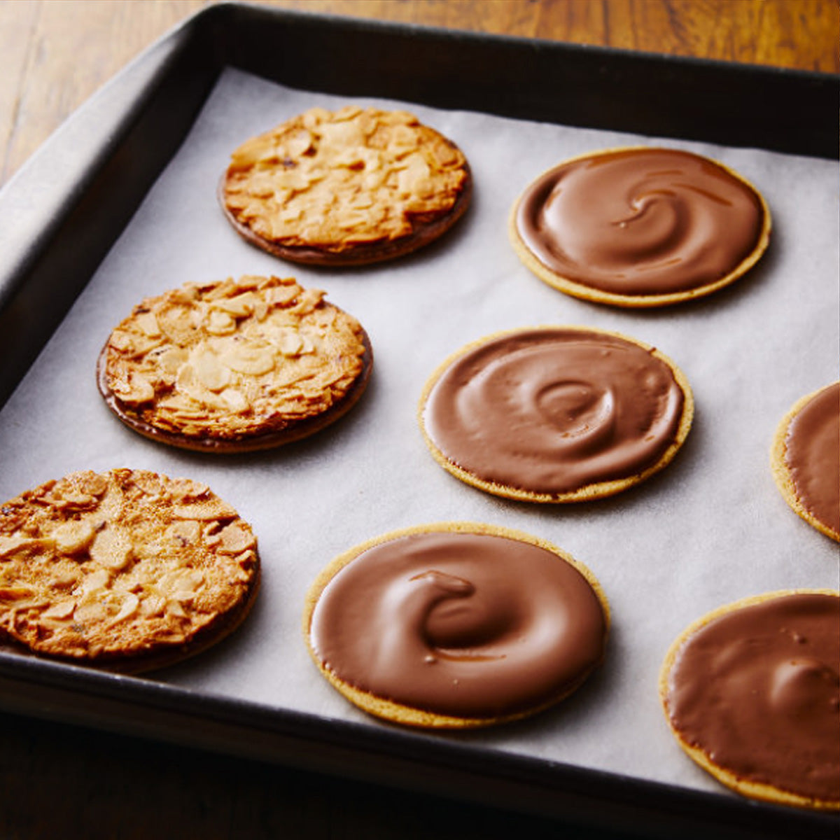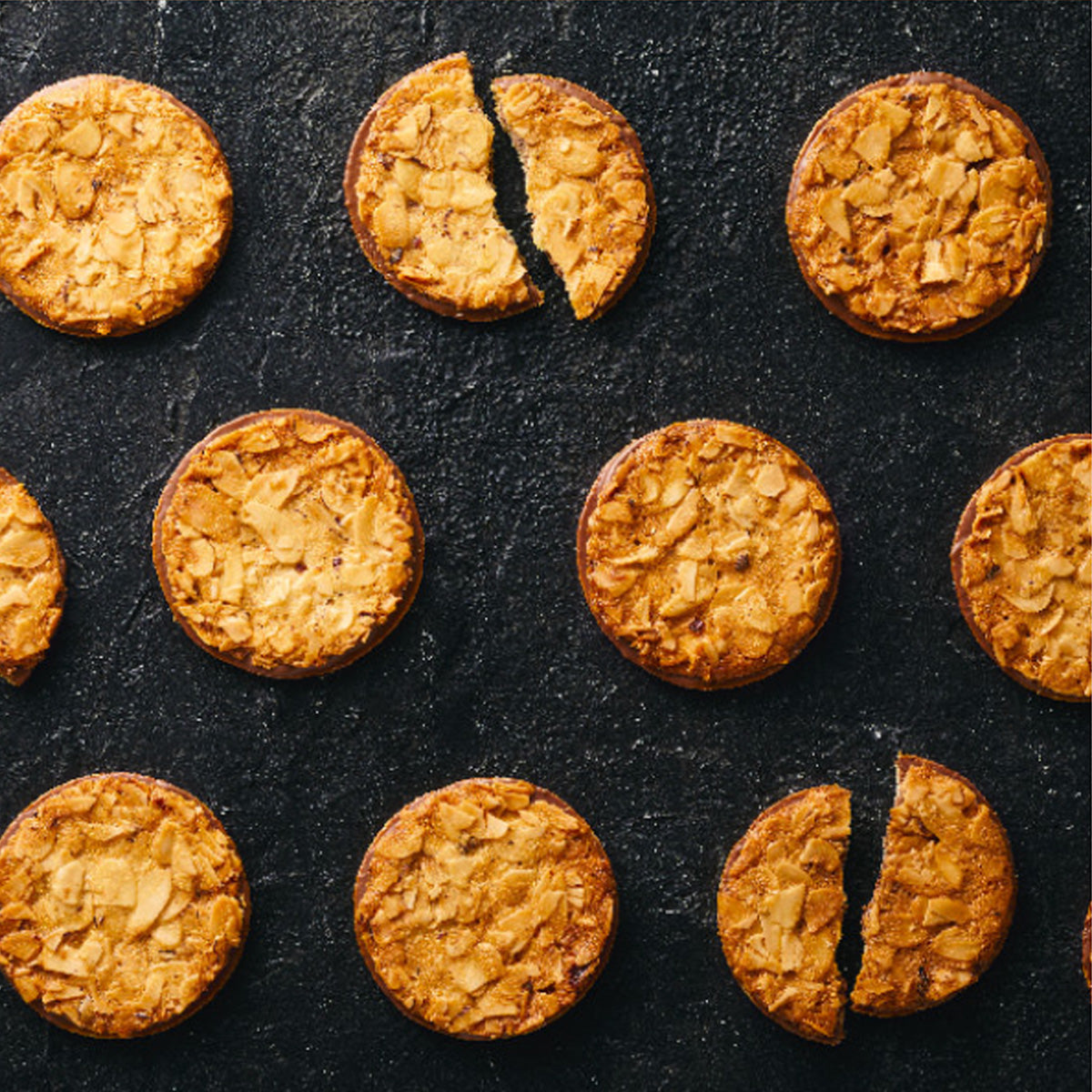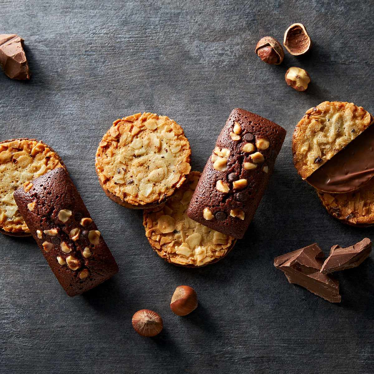 ヘーゼルナッツとアーモンドをふんだんに使用した"パリッ"とした「チュイールクッキー」。生地にアーモンドパウダーを混ぜ込んだ"ザクザク"の薄焼きクッキー。2種類の食感異なるクッキーで、ミルクチョコレートをサンドしました。