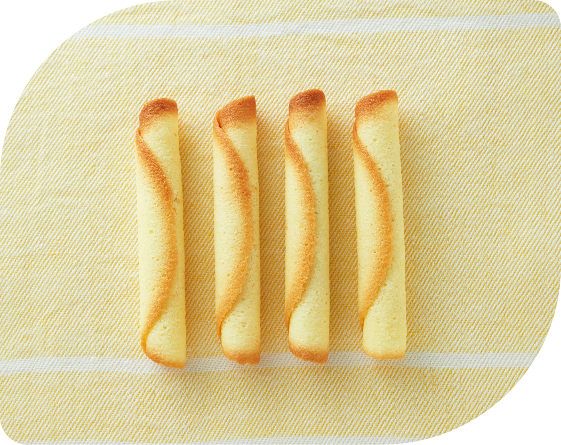 レモンピール入りのさくっと繊細なラング・ド・シャ生地を、葉巻のようにくるんと巻き上げた爽やかな味わいのクッキー。