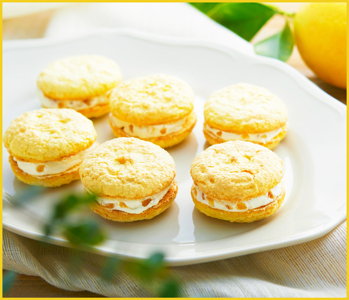 レモンの香りと口の中でやさしくとけあう心地よい食感にこだわった、さわやかなレモンクリームサンドです。
